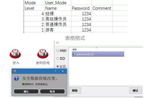 (2)結(jié)合其他專案內(nèi)容,下載到人機(jī)界面中,使用改功能時(shí)一樣也需要先登入哦。然后選擇U盤路徑下載的用戶文件(.CSV格式的文件,可以用EXCEL軟件打開編輯),具體表格格式如下: