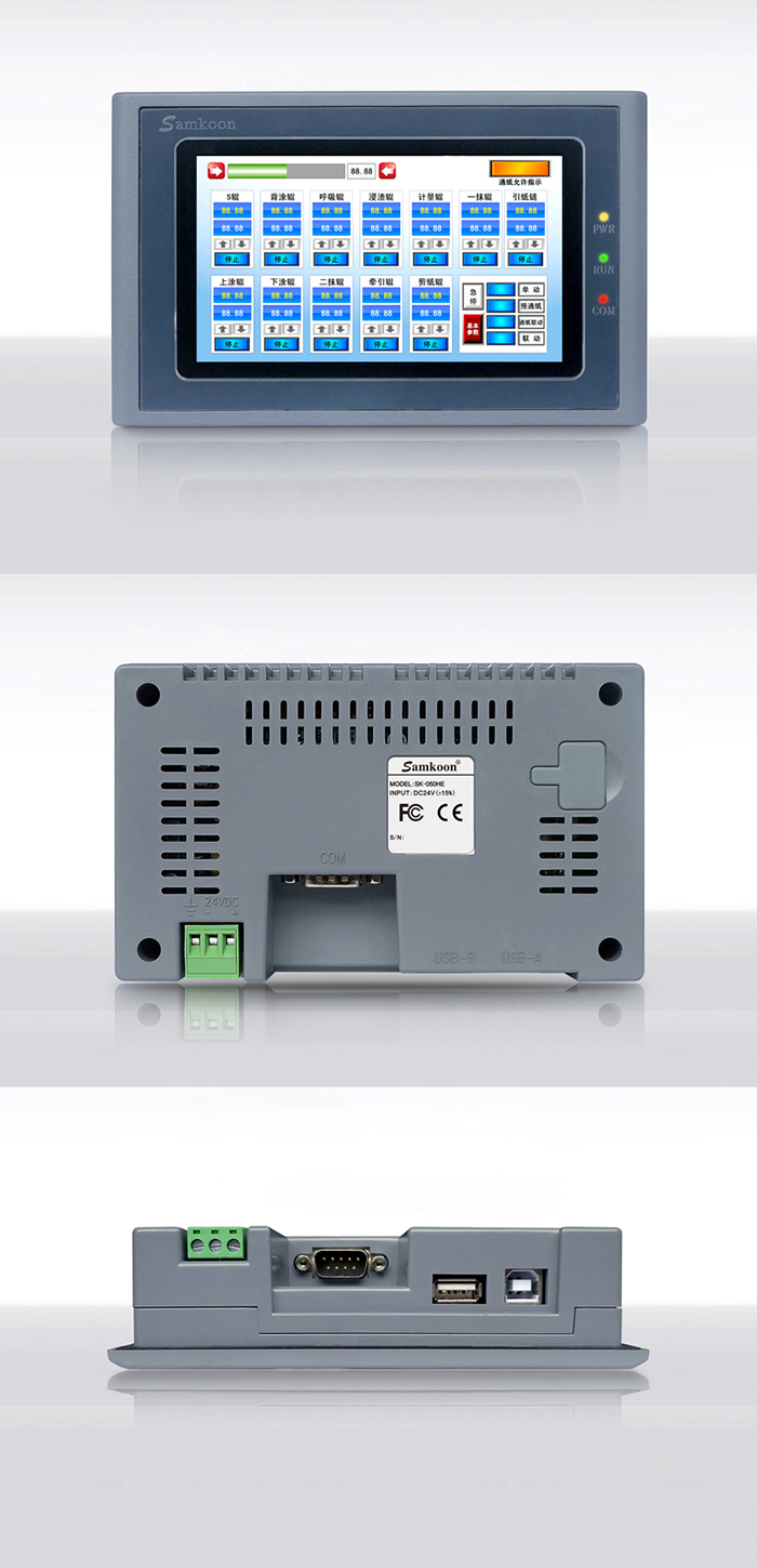Samkoon SK系列觸摸屏是一款基于Linux系統的人機界面,符合EN55022和EN55024標準,符合FCC、CE、Class A,具有很強的抗干擾能力,符合工業環境的電磁兼容要求。該款產品配備有高性能的Cortex A8處理器,及高容量FLASH,可存儲大量數據,實現數據斷電不丟失;支持U盤存儲,可以實現數據的導入導出、工程更新及配方更新功能;支持在線及離線模擬,可直接從PLC中獲取數據;支持串口打印機,顯現畫面及數據打?。恢С忠黄炼鄼C,實現最大連接32個PLC或智能設備;支持多國語言,可實現5種語言任意切換;支持以太網通訊下載功能。