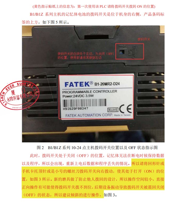 請(qǐng)務(wù)必將此撥碼開關(guān)撥到 ON 的位置,否則會(huì)導(dǎo)致程序、數(shù)據(jù)丟失等影響,耽誤您的設(shè)備運(yùn)行。為了防止在運(yùn)輸過程中,黃