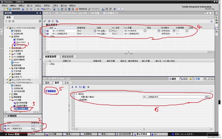 1、在PLC里建立DB1數據塊,里面設兩個開關量“PLC秒開關”和"人機響應開關”,
