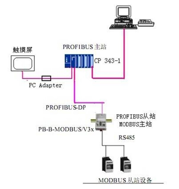 通過PLC CPU上的Profibus DP接口,連接到Profibus轉(zhuǎn)Modbus協(xié)議轉(zhuǎn)換模塊(PB-B-MM),再連接到兩臺空氣壓縮機以及控制柜上多功能電力監(jiān)測儀表的Modbus接口,來讀取空氣壓縮機的運行參數(shù)和多功能電表的電流電壓功率等電力狀態(tài)數(shù)據(jù),以及向空壓機發(fā)送啟停命令等。
